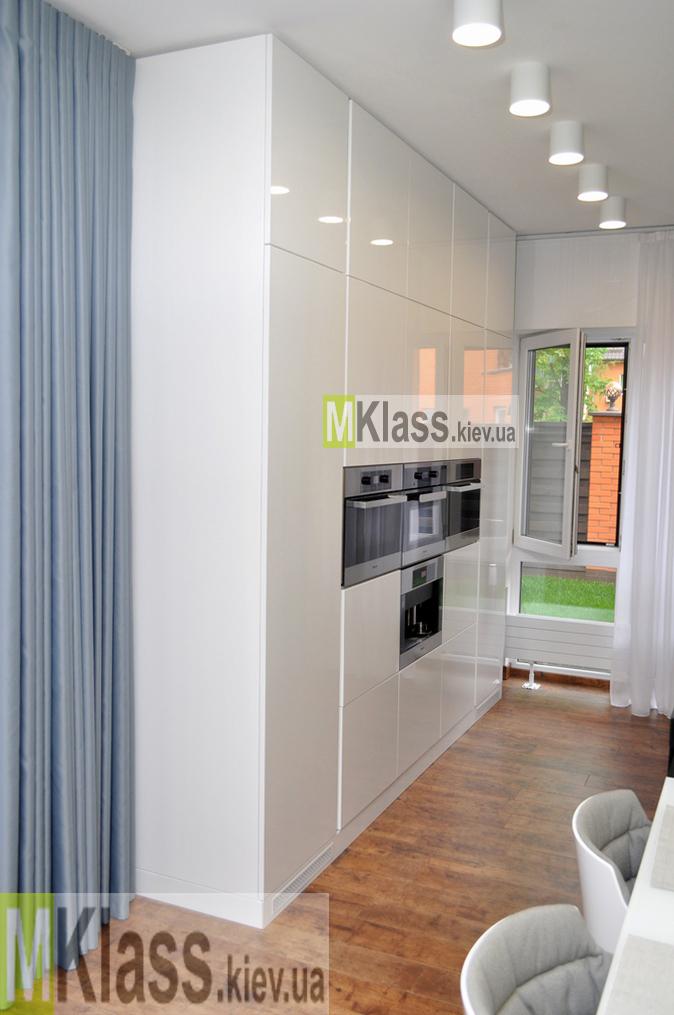 Открывание фасадов: система TIP-ON (нажатием), кроме боковых пеналов, которые открываются за фрезерованную ручку. В острове выдвижные ящики со скрытыми направляющими MOVENTO с системой TIP-ON BLUMOTION (нажатие с доводчиком).